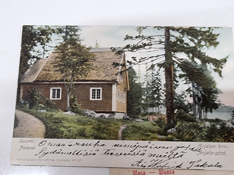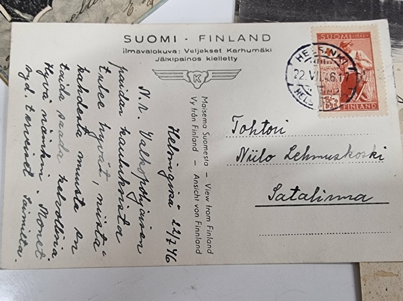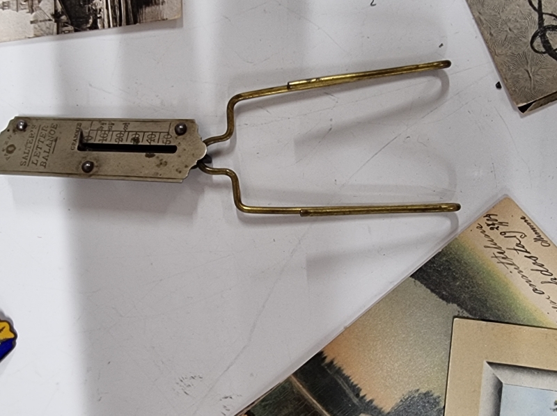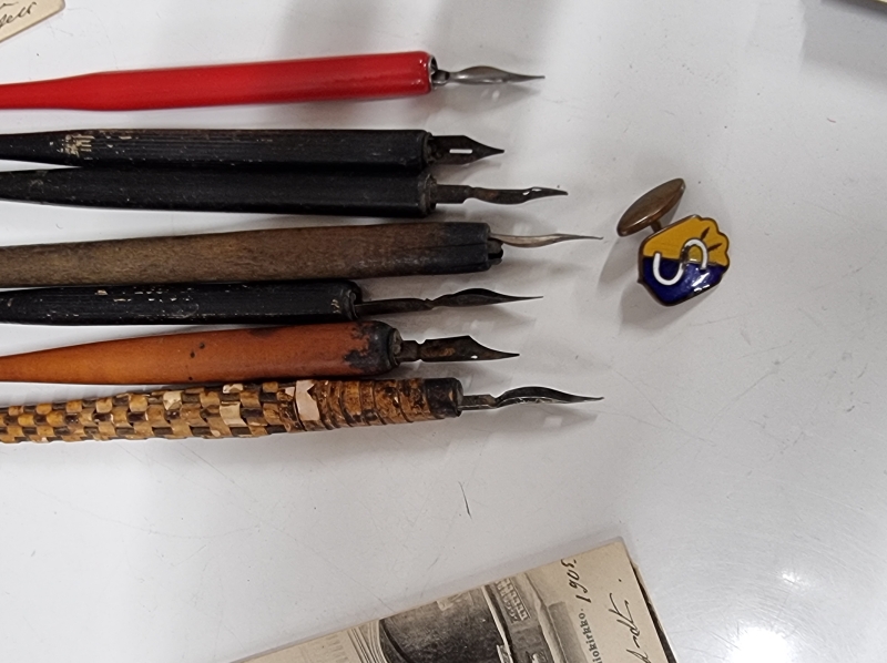 #2516 - Vanhoja kortteja, mustekyniä, ym., mm. Suojeluskunta kalvosinnappi