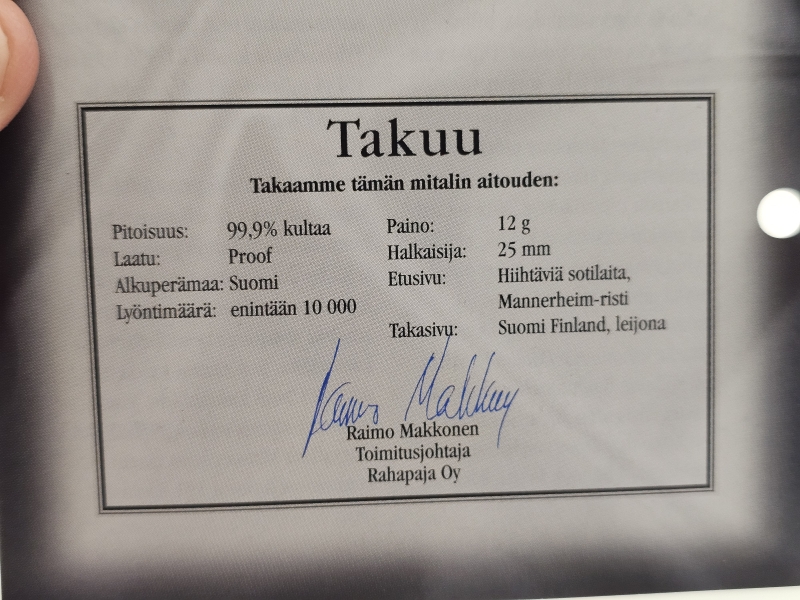 Paino 12g. Pitoisuus 999/1000. Mukana takuutodistus