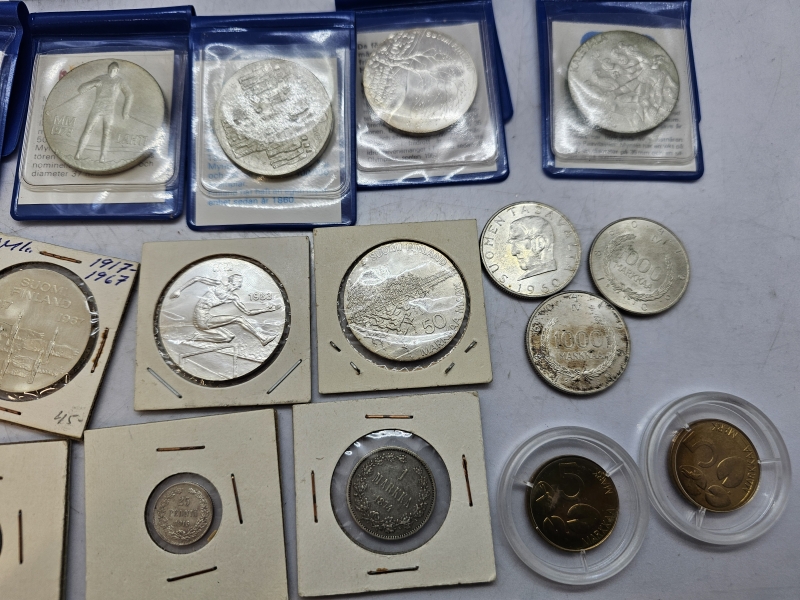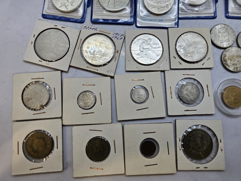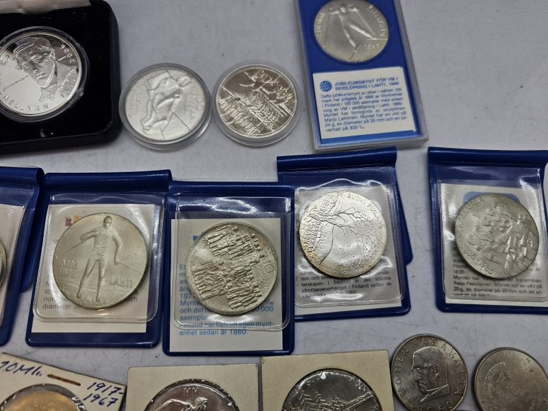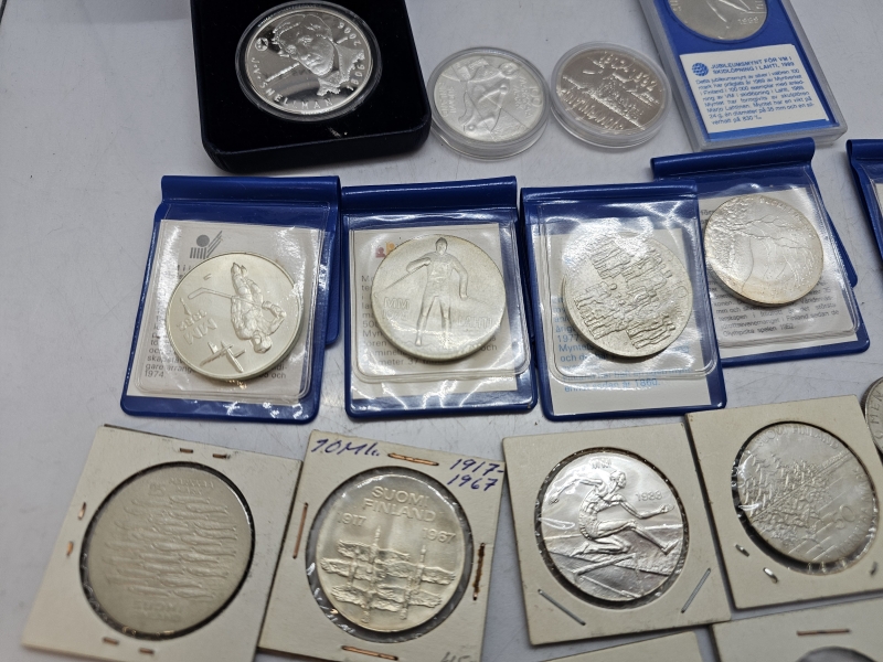 #1379 - Erä kolikoita ja juhlarahoja joista suurin osa hopeaa