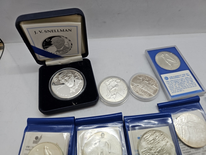 #1379 Erä kolikoita ja juhlarahoja joista suurin osa hopeaa