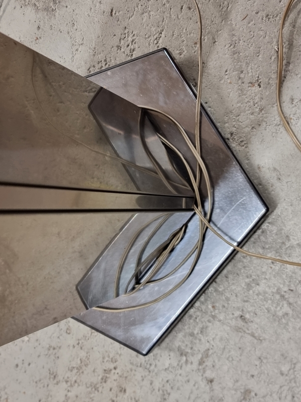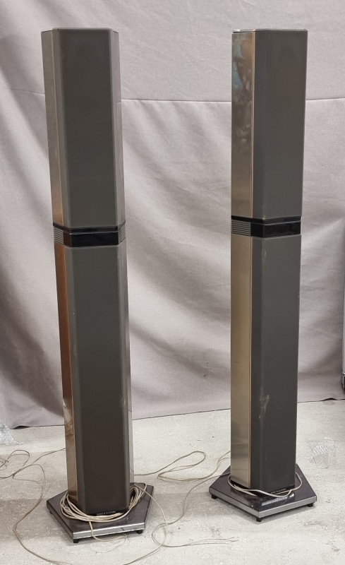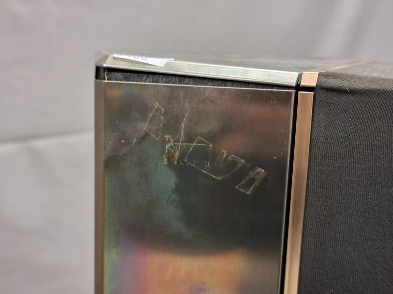 Yhdistelmälaitteisto neljällä kaiuttimella. Vahvistin ei toimi. Isommissa kaiuttimissa pintakolhuja ja kulumaa. K: 150cm