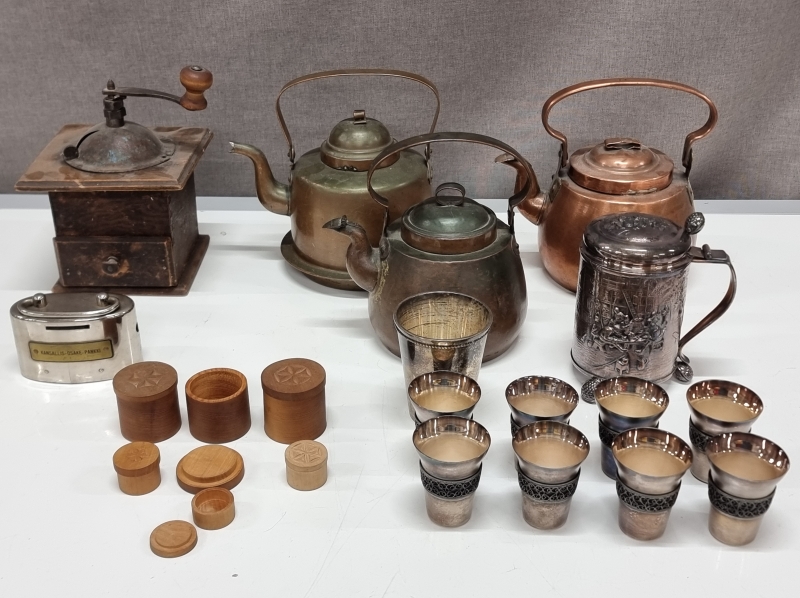 #2267 - Keräilytavaraa: 3kpl kuparipannuja, KOP säästölipas ym.