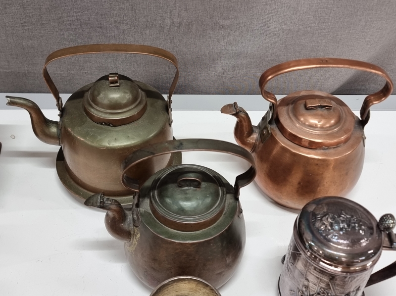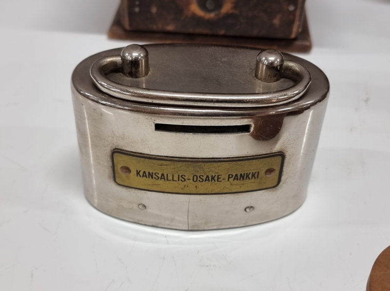 #2267 Keräilytavaraa: 3kpl kuparipannuja, KOP säästölipas ym.