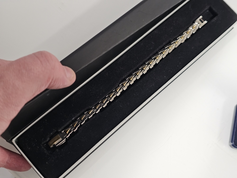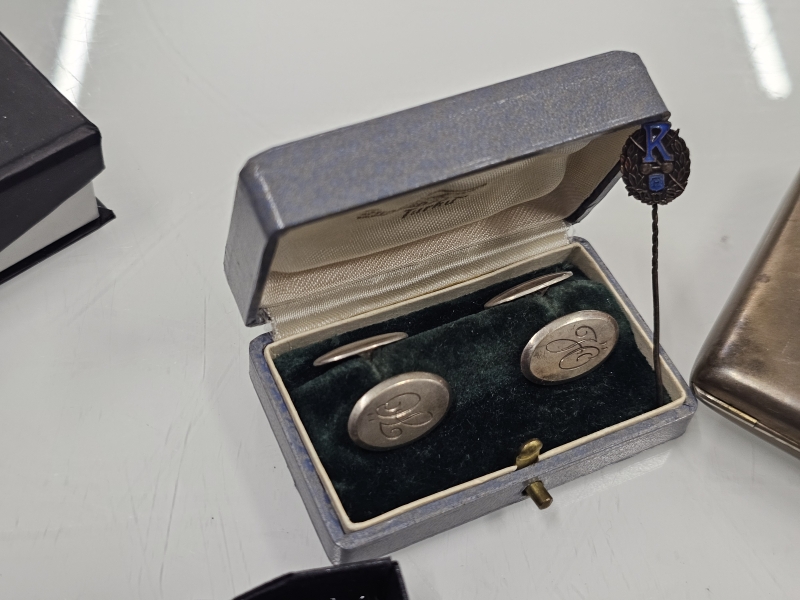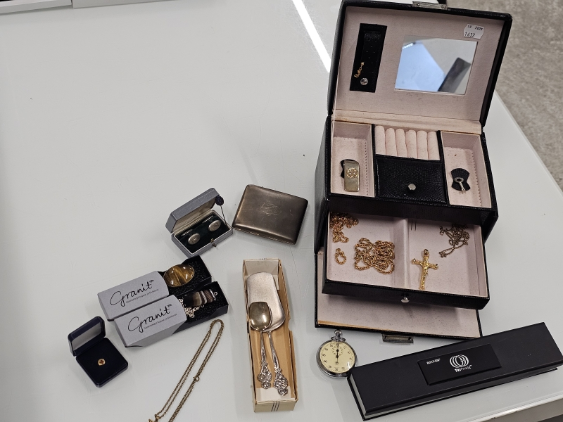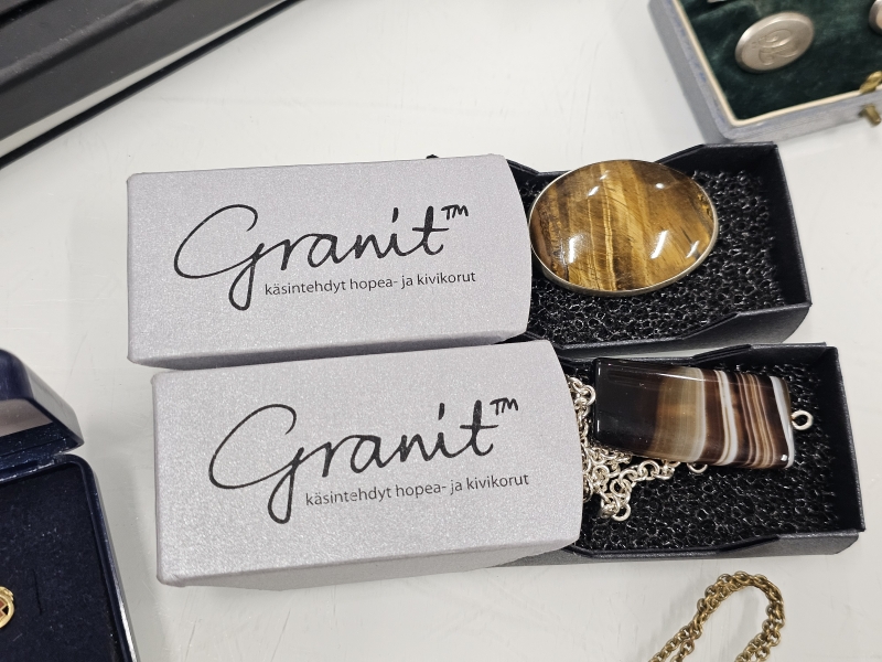 #1030 - Erä tavaraa: Mm. Granit hopeakoruja, korurasia, krusifiksi-riipus, taskukello