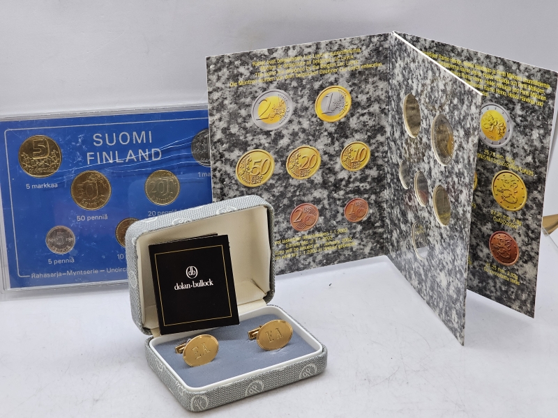 #2529 Kullatut kalvosinnapit + 2kpl rahasarjoja