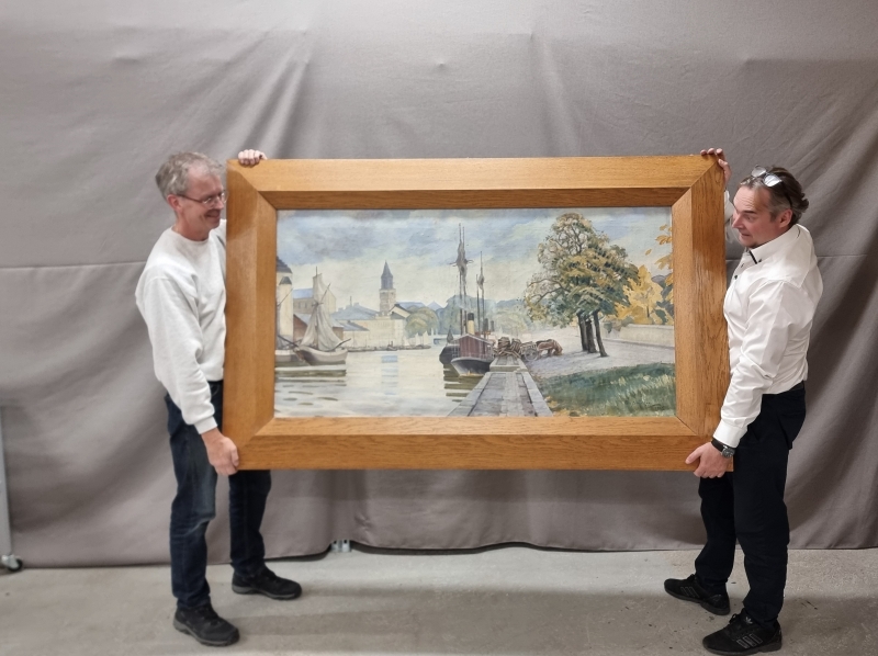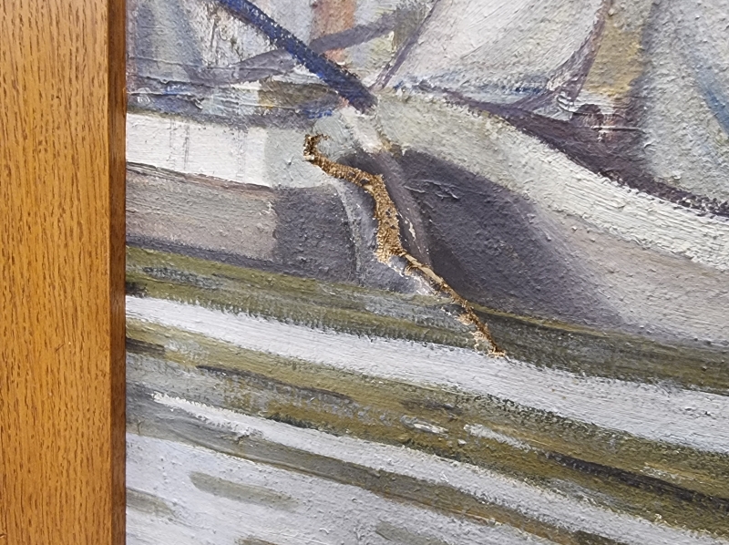Taulussa viiltohalkeama. Kannattaa entisöidä. Leveys 180cm ja korkeus 112cm.