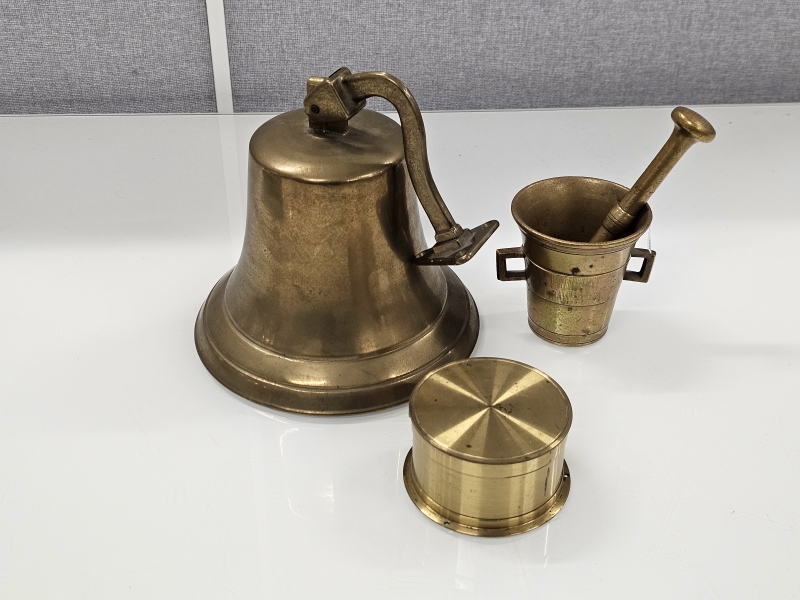 #2142 - 3kpl messinkiesineitä: Soittokello, kompassi & mortteli