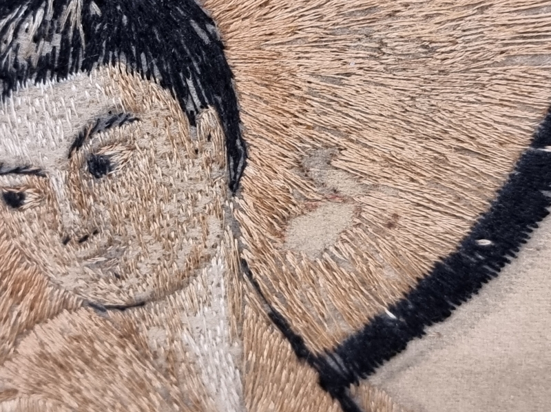 Itämaisilla koristeilla. Lankoja poikki. Yhdestä puukoristeesta puuttuu palanen.L: 62cm k: 104cm