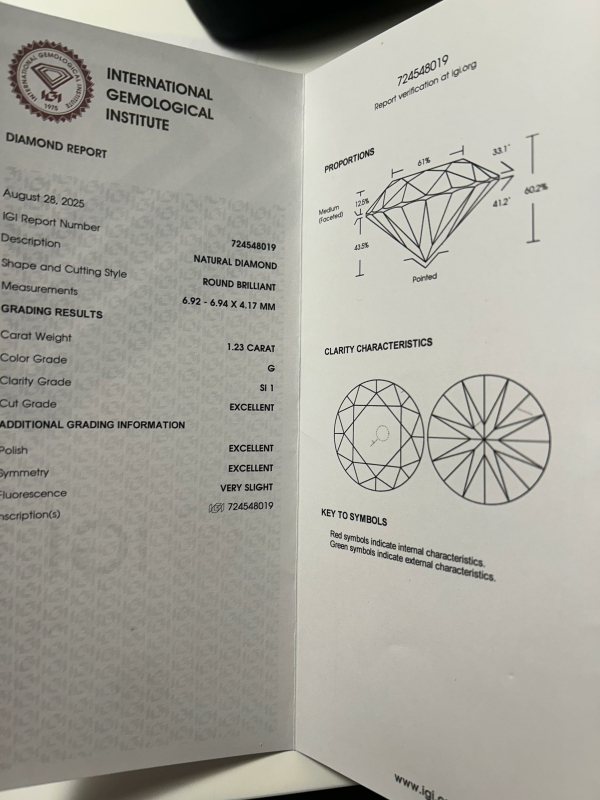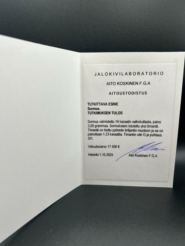 IGI todistus + vakuusarvio, bruttopaino 3,59g, koko 17.
