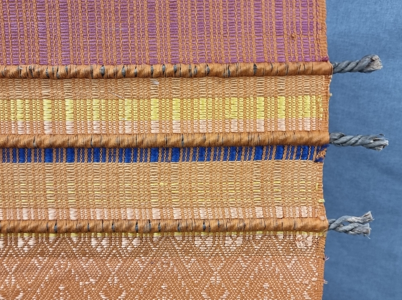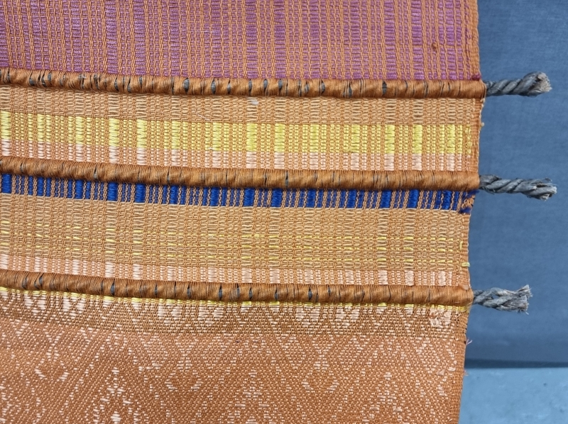 Käsityönä valmistettu. Silkkiä ja puuvillaa. Vaatteen valmistusprosessi kesti n. 2 vuotta. Leveys: 76cm korkeus: 175cm. Tukipuun leveys 106cm