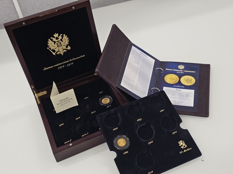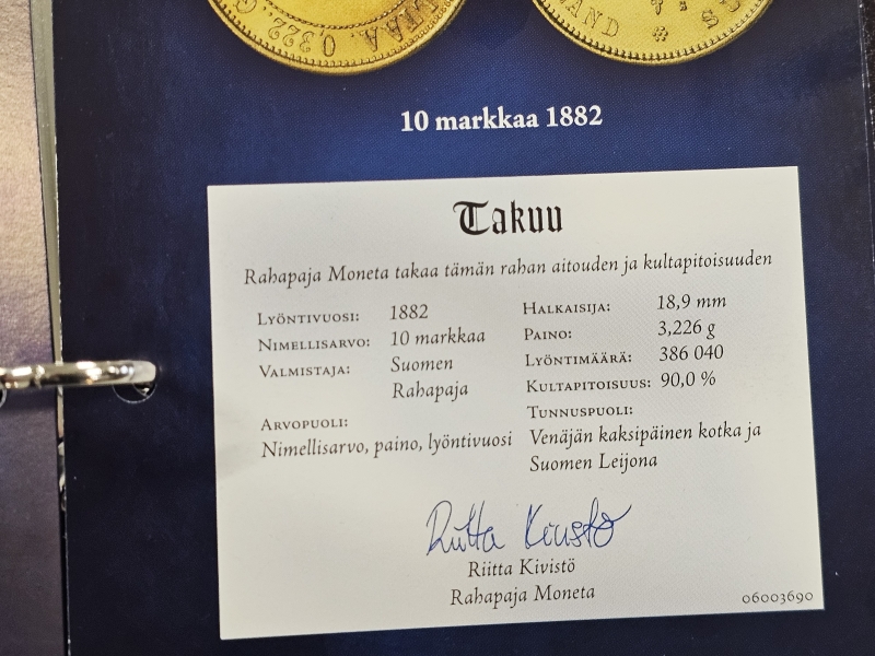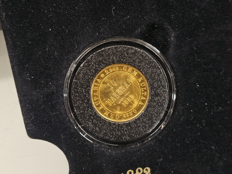 Paino 3,23g + 6,45g. Mukana Suomen ensimmäiset kultamarkat -keräilylaatikko ja paperit. Pitoisuus 900/1000