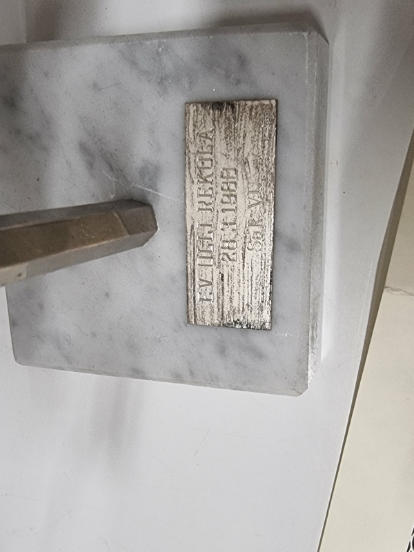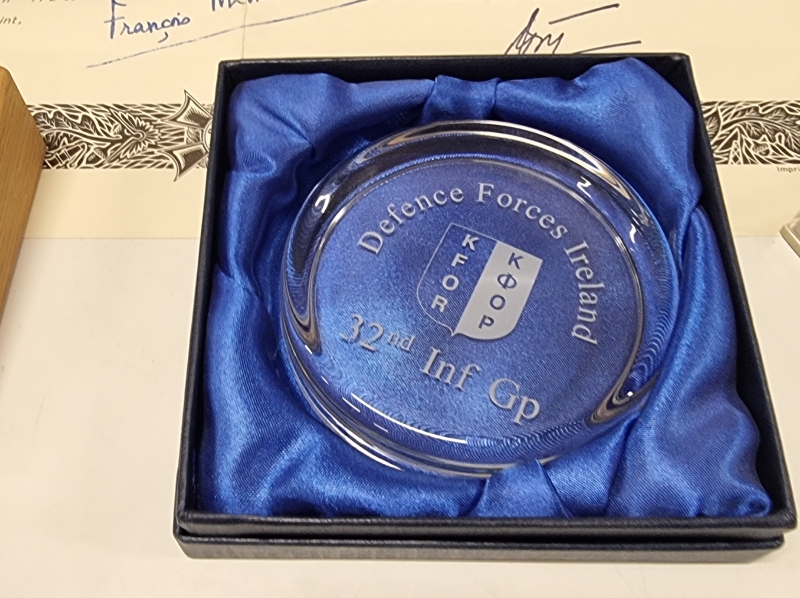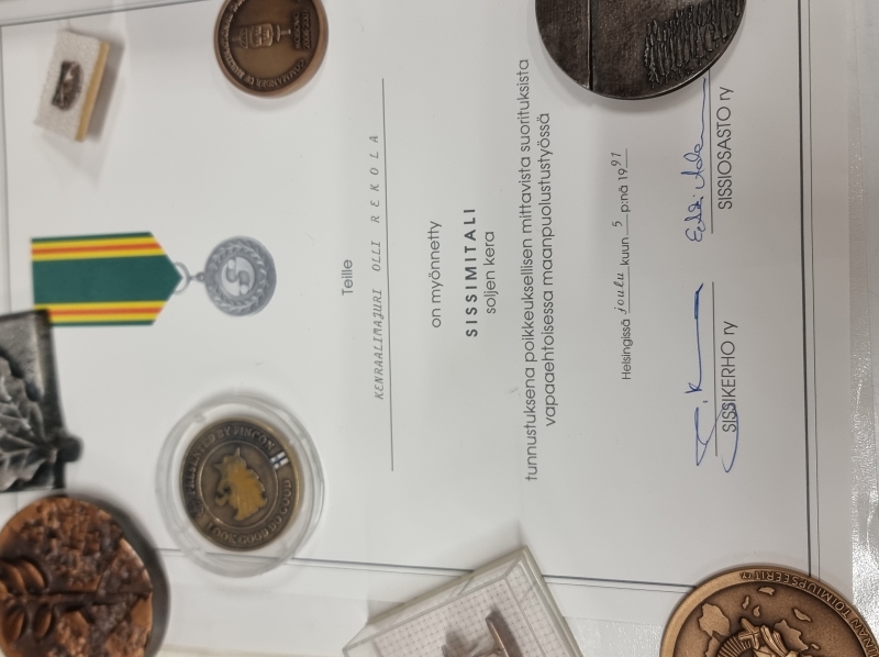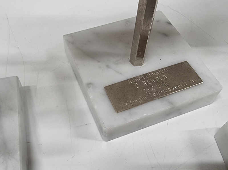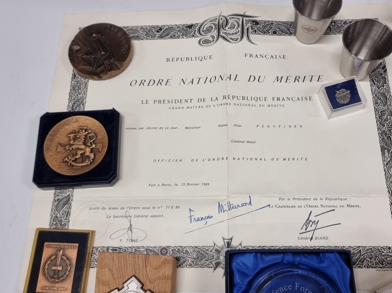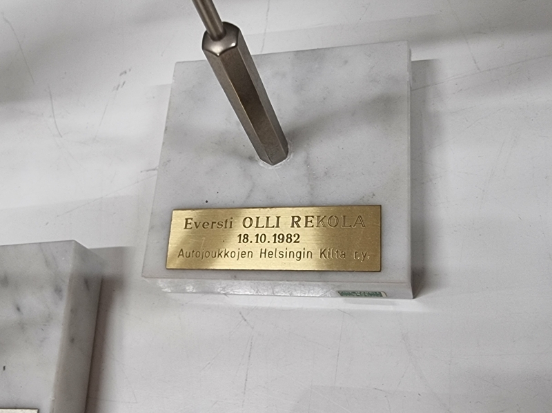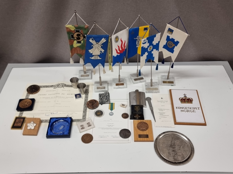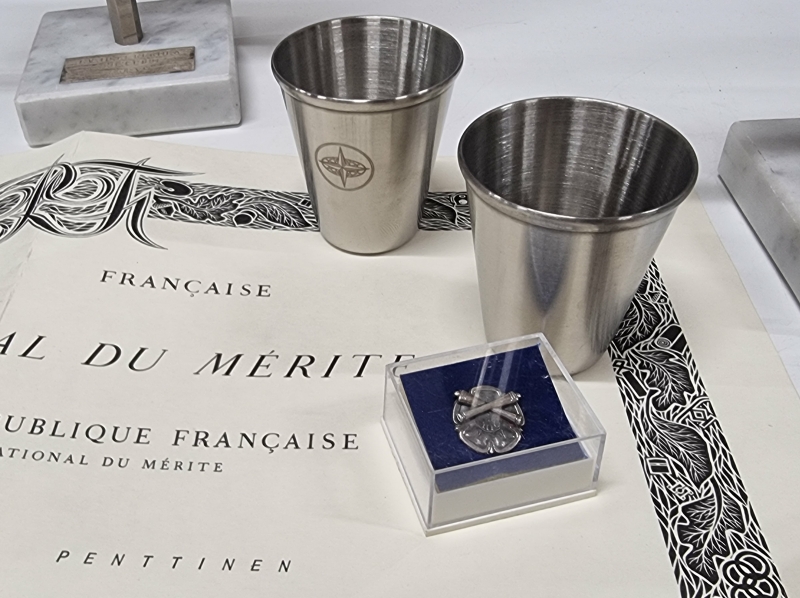 #1712 - Hyvä erä militariaa, mm. pöytämitaleja, standaareja, kalvosinnapit