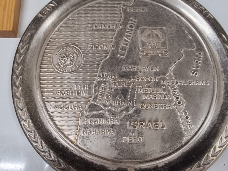 #1712 Hyvä erä militariaa, mm. pöytämitaleja, standaareja, kalvosinnapit