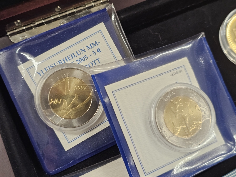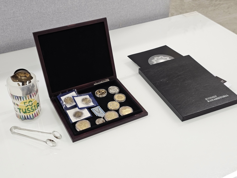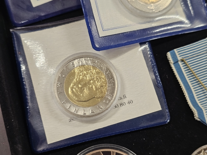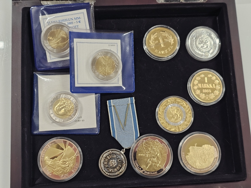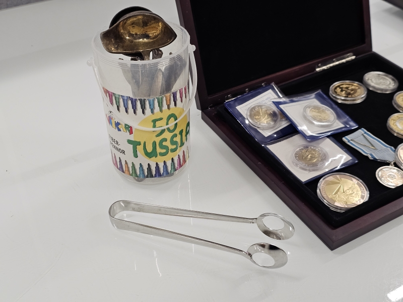 #1603 - Erä juhlarahoja, hopeoidut aterimet ym.