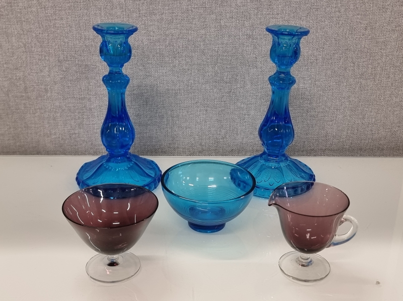 #301 - 5kpl lasiesineitä mm. Riihimäen lasin kynttilänjalat