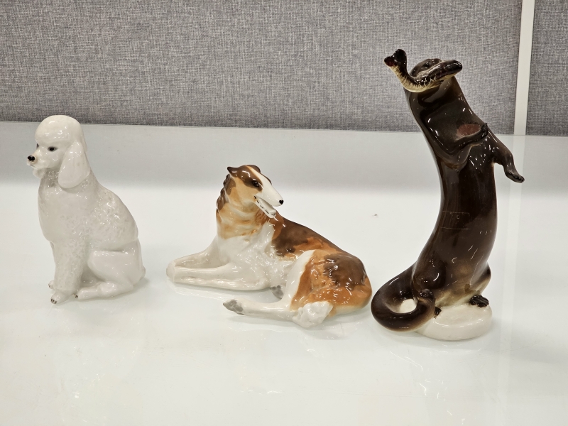Korkein 22cm. Valkoisessa pohjassa maalia, toisen koiran tassut puuttuvat ja korkeimmassa korjausmaalauksia