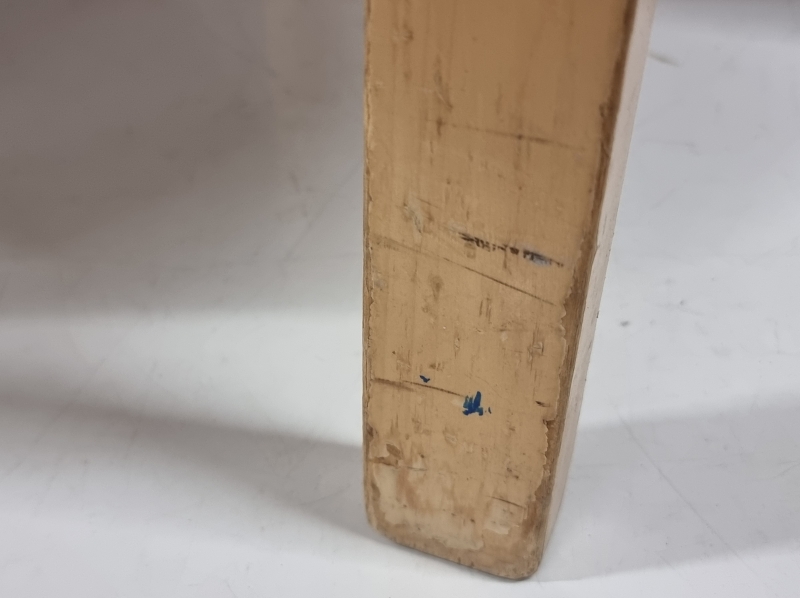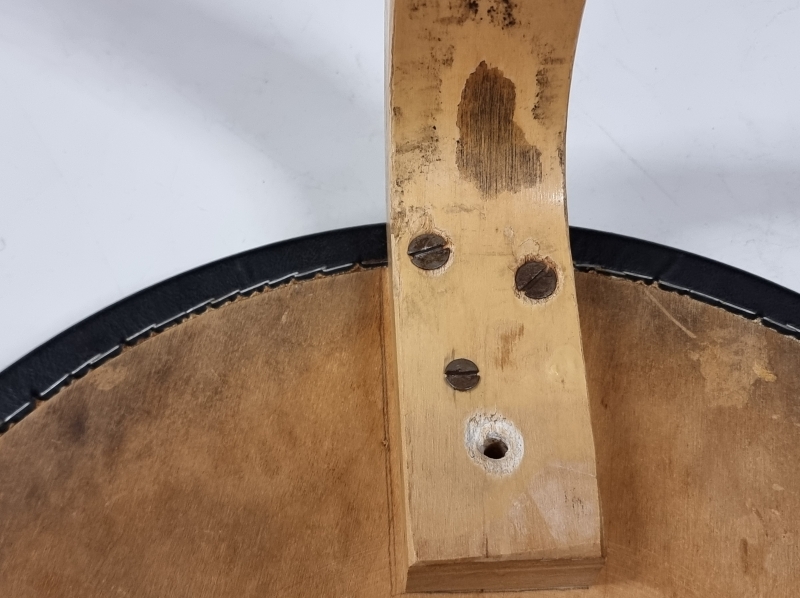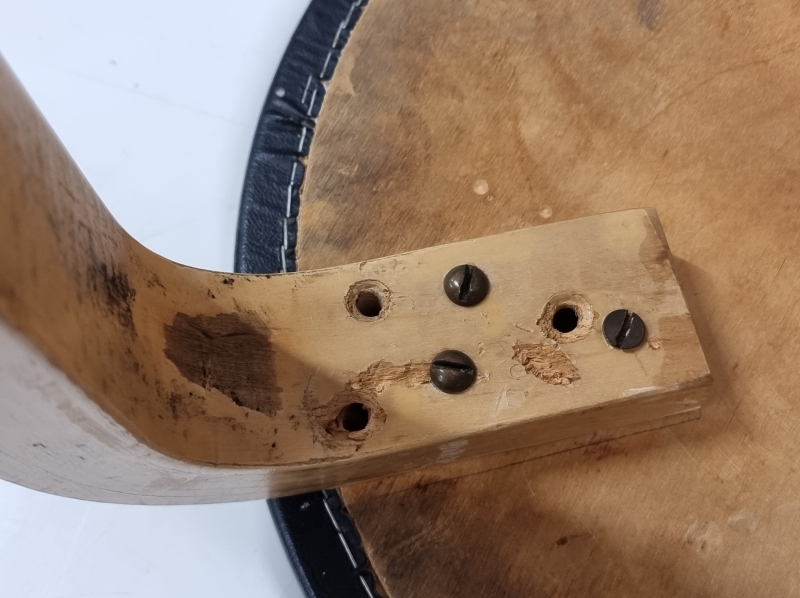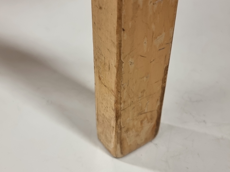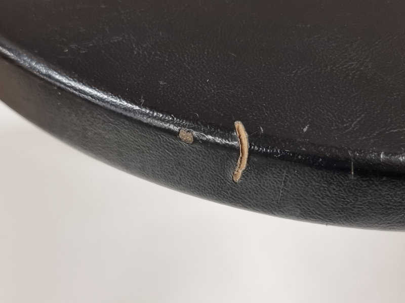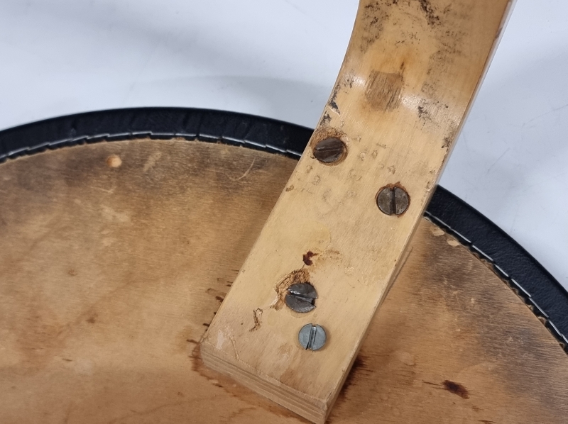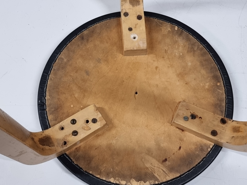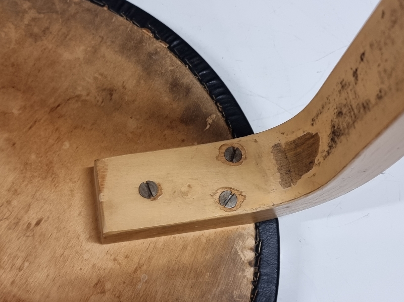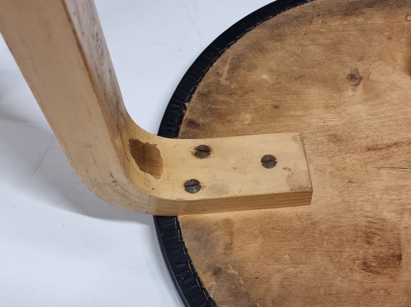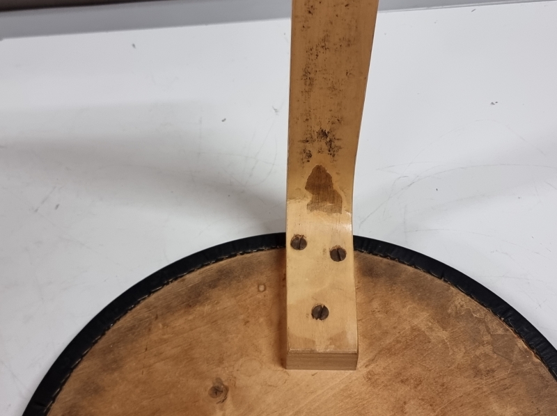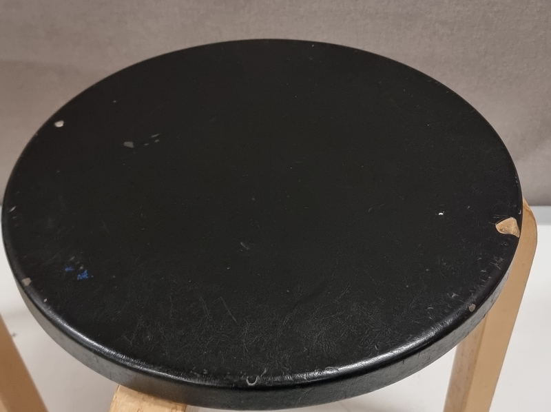 Päällyksestä pala pois ja kulumaa. Toisen jakkaran ruuveja vaihdettu. Korkeus: 43,5cm