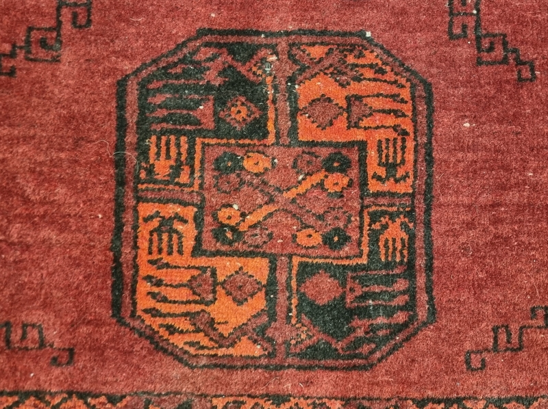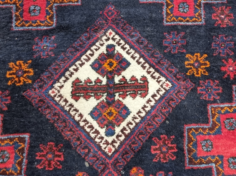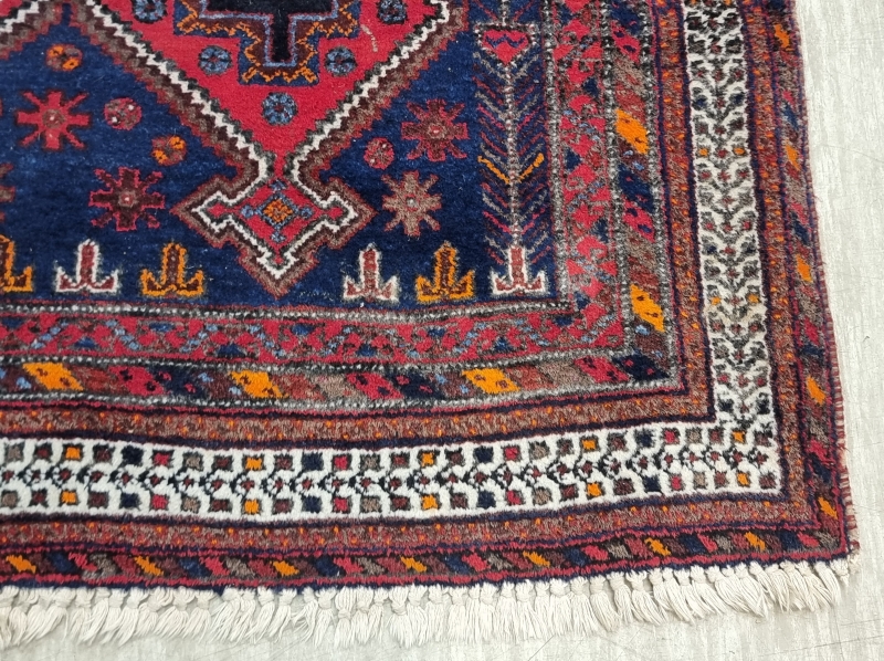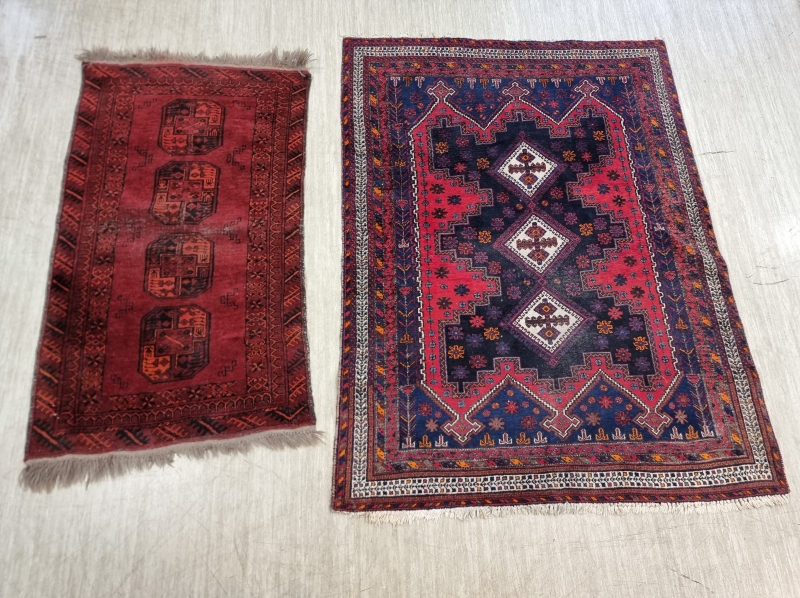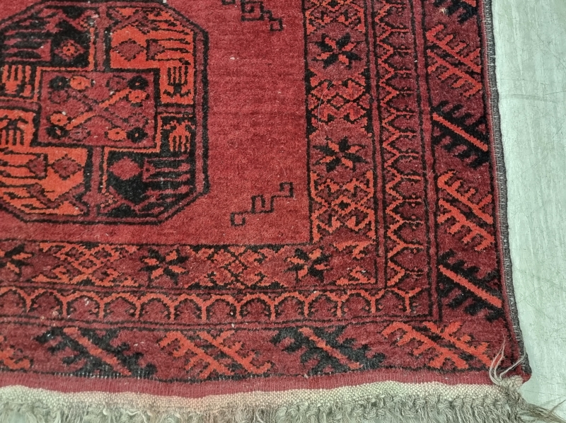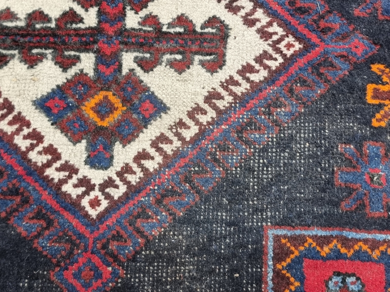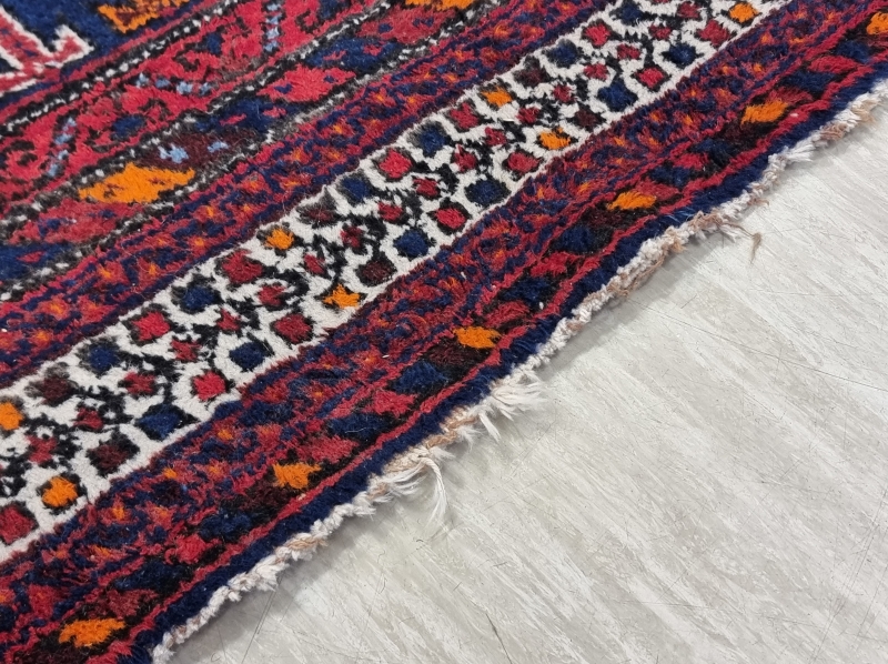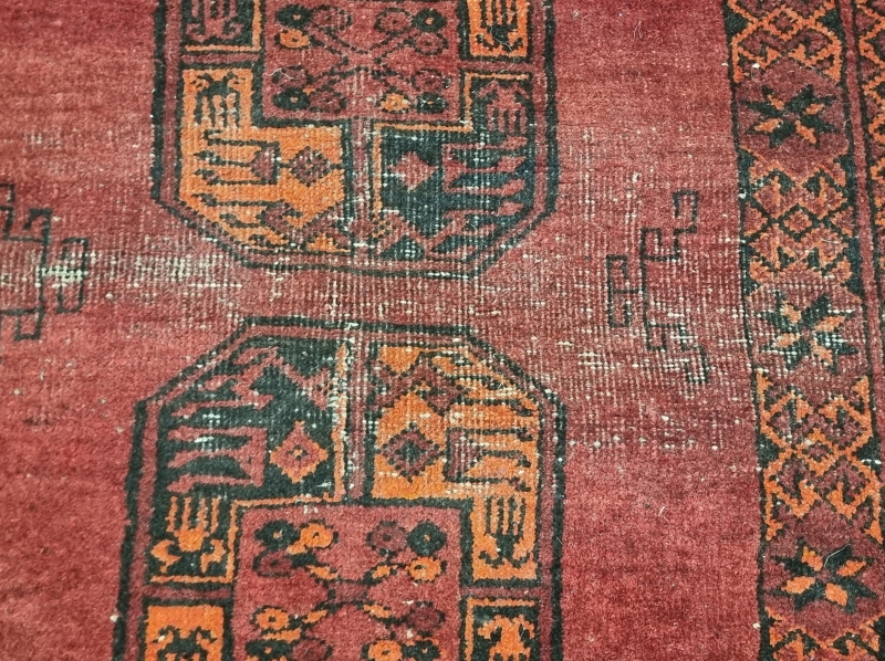 Huomattavaa kulumaa, hapsuissa puutteita, toinen matoista kiertynyt. Isompi 163cm x 210cm