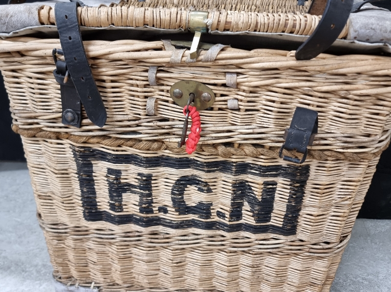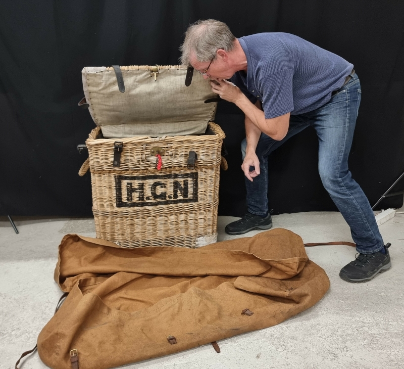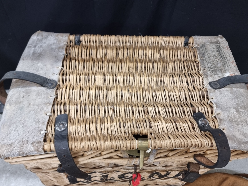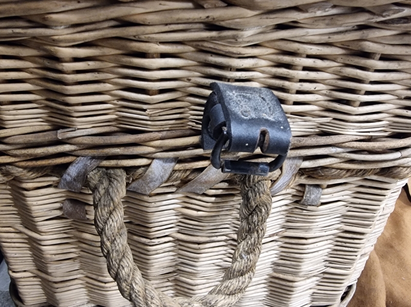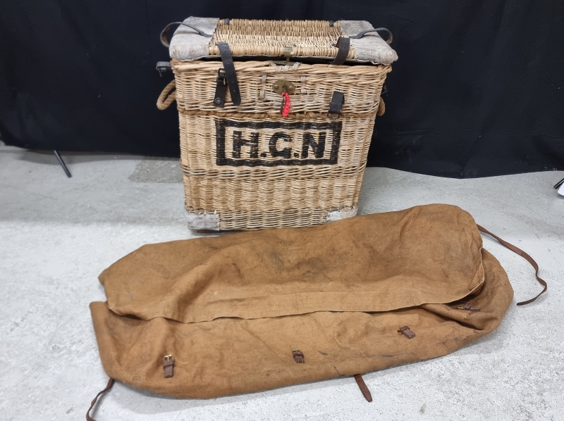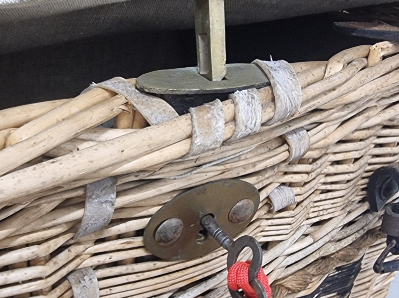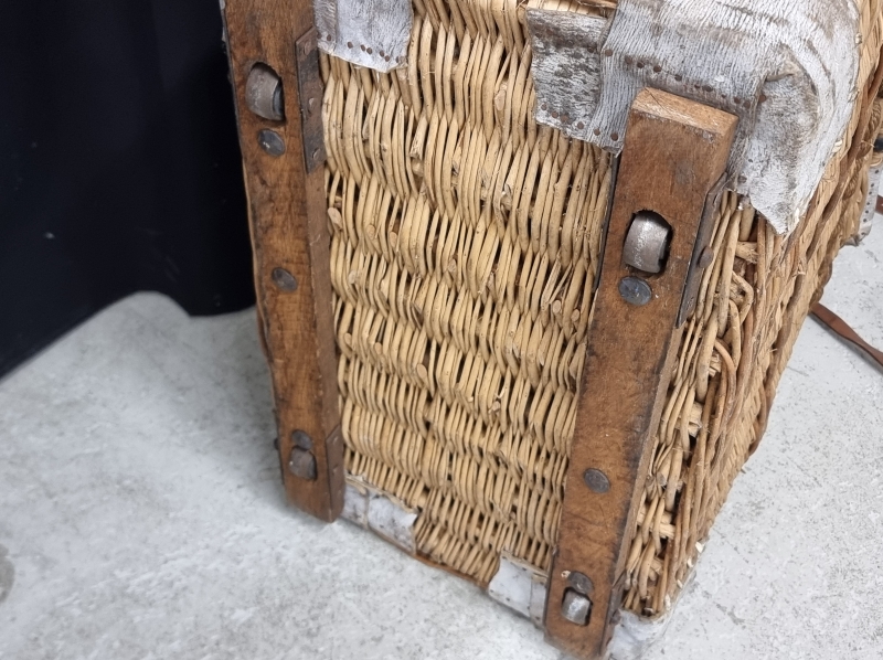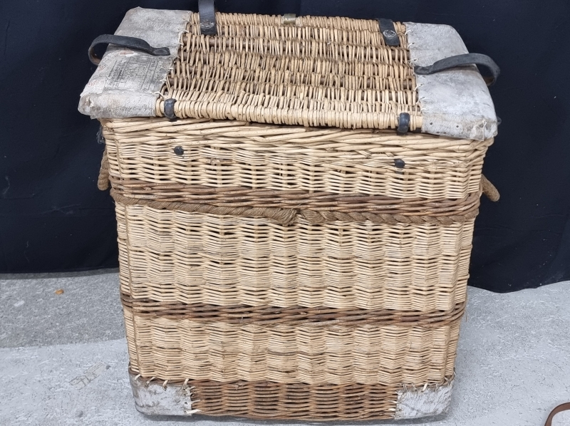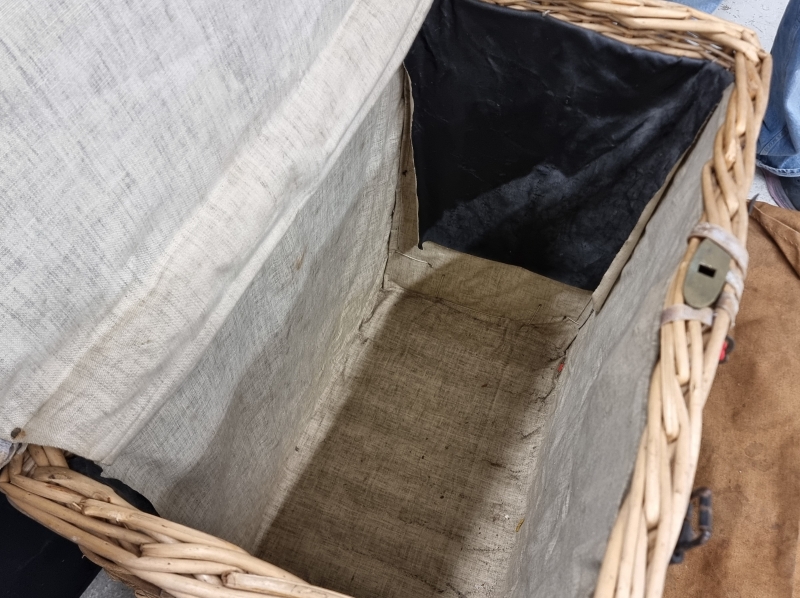 #2100 - Rottinkinen lukittava vanha kuljetusarkku pyörillä + asesäkki