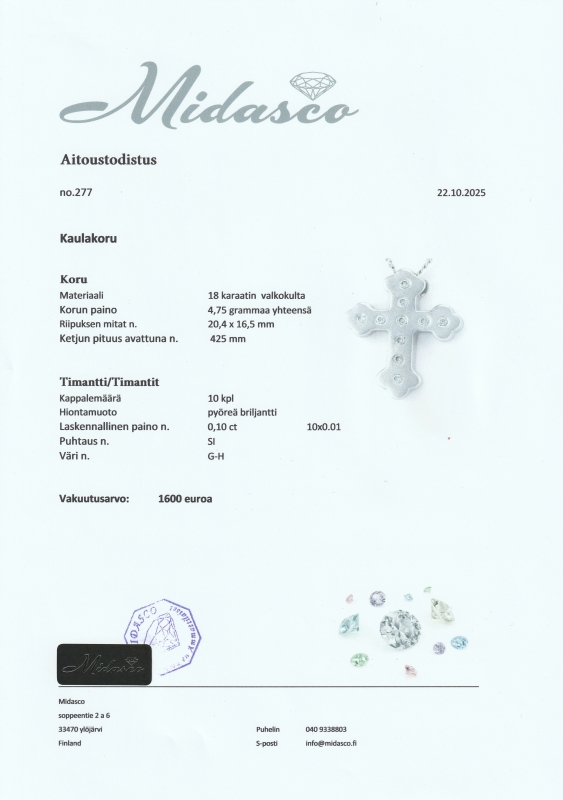 Mukana aitoustodistus sekä uusi korurasia. Bruttopaino 4,75g.