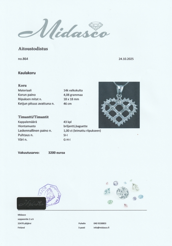 Mukana aitoustodistus sekä uusi korurasia. Bruttopaino 4,08g.
