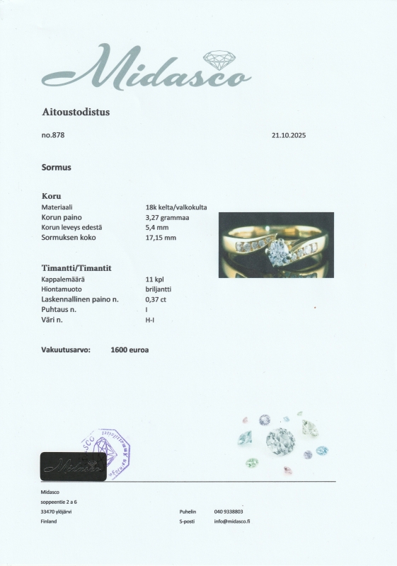 Mukana aitoustodistus sekä uusi korurasia. Koko hyvin muokattavissa ammattilaisen toimesta [ei kuulu hintaan]. Bruttopaino 3,27g. Koko 17,15