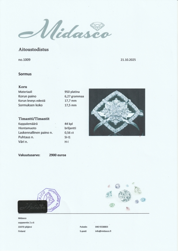 #1238 Käyttämätön platinasormus jossa 44 timanttia [yht. 0,56ct], 6,27g