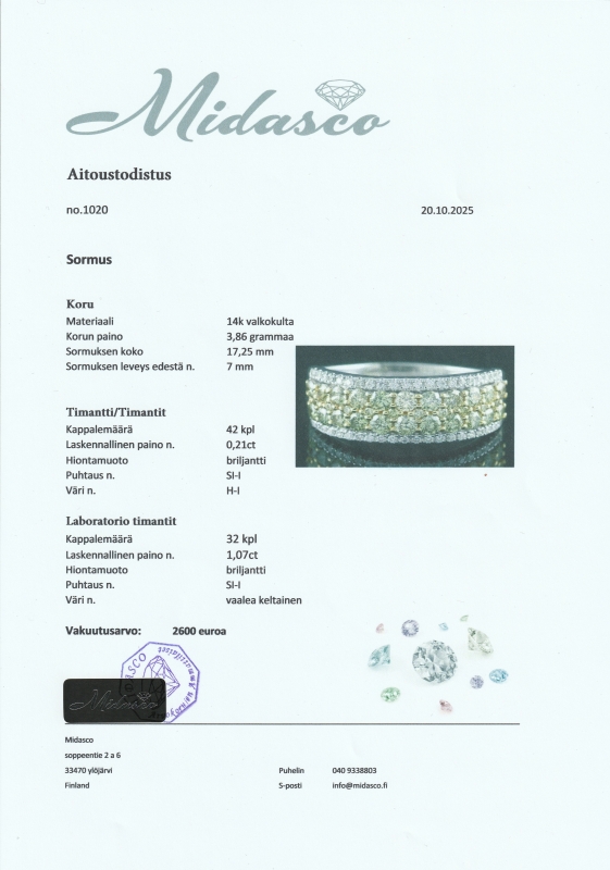 Mukana aitoustodistus sekä uusi korurasia. Koko hyvin muokattavissa ammattilaisen toimesta [ei kuulu hintaan]. Bruttopaino 3,86g. Koko 17,25