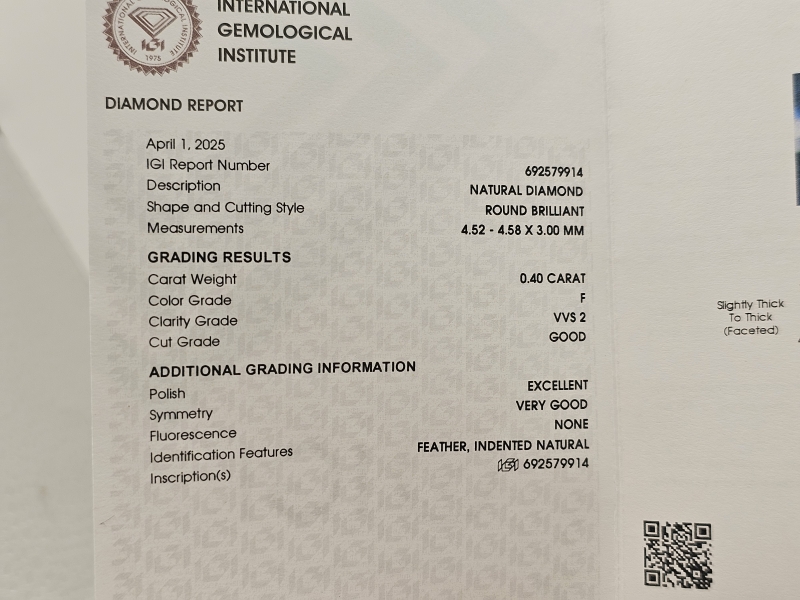 Bruttopaino 0,68g. Mukana aitoustodistukset timanteille. Timanteihin kaiverrettu sertifikointinumero