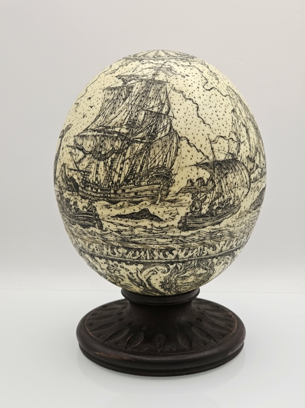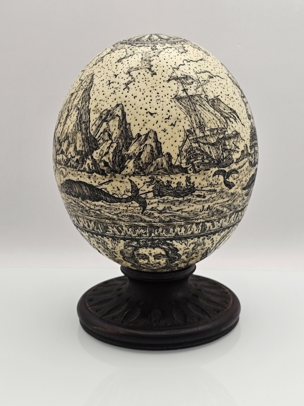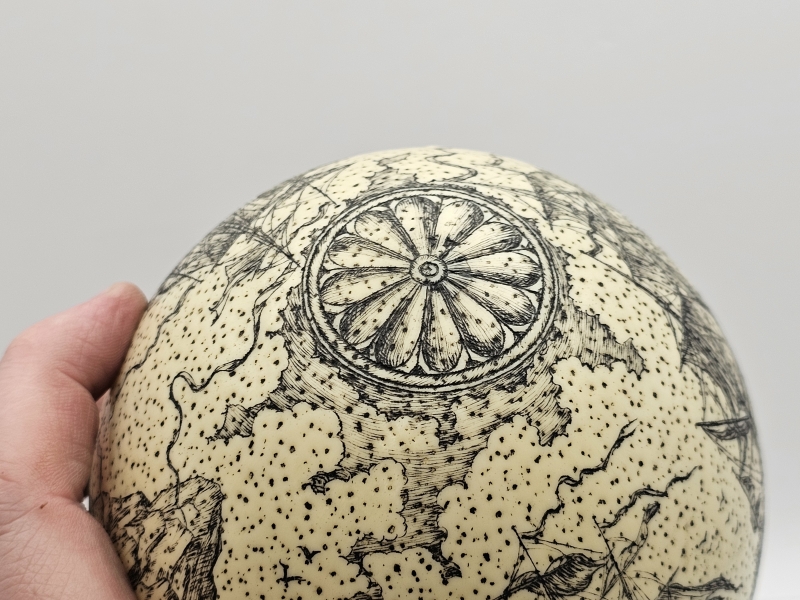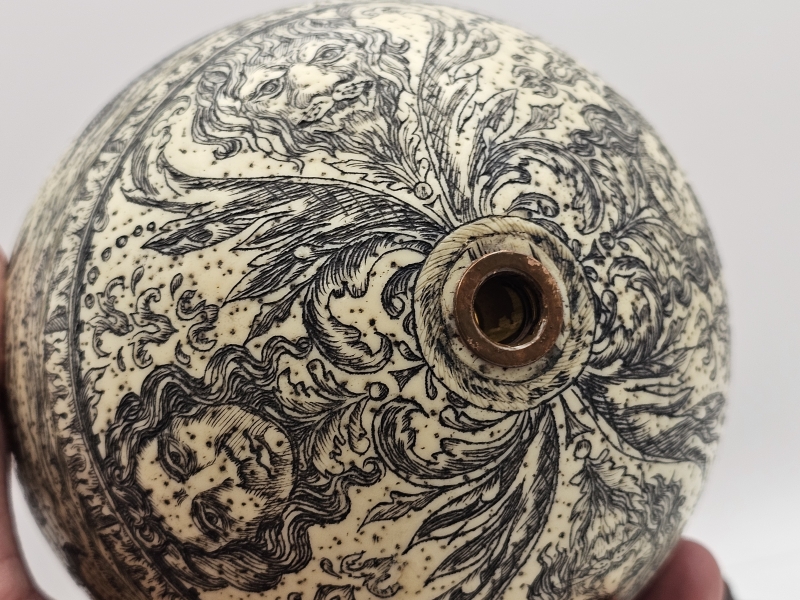 #2006 - Taidokkaasti kaiverruskoristeltu strutsin muna jalustalla