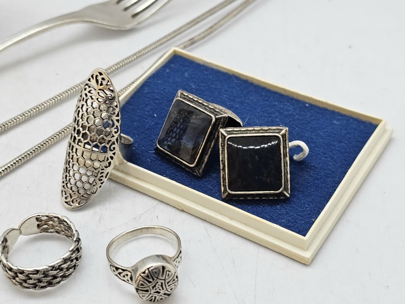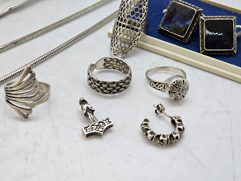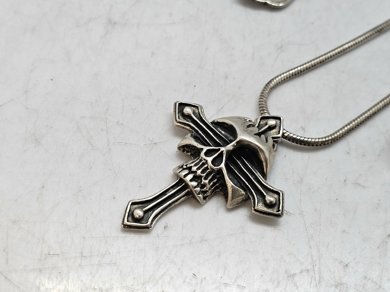 #1229 Erä hopeakoruja: Mm. pääkallokaulakoru + hopeoitu pikari ja haarukka