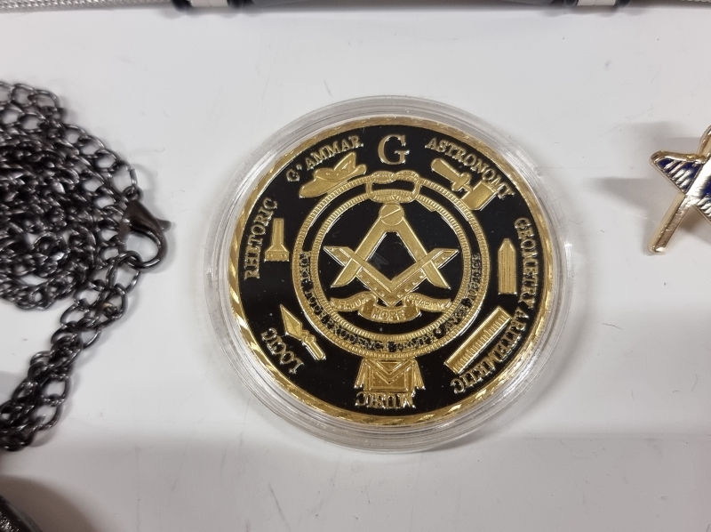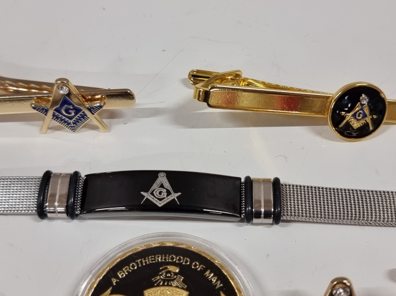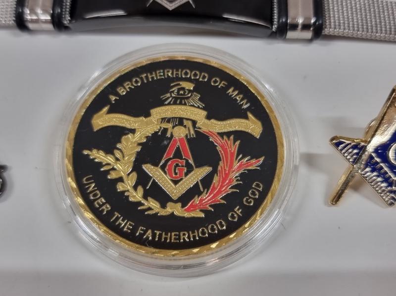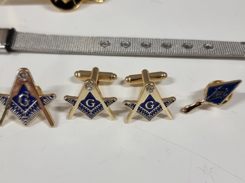 #2009 - Erä Vapaamuurareiden esineitä. Mm. taskukello, kalvosinnapit, solmioneula