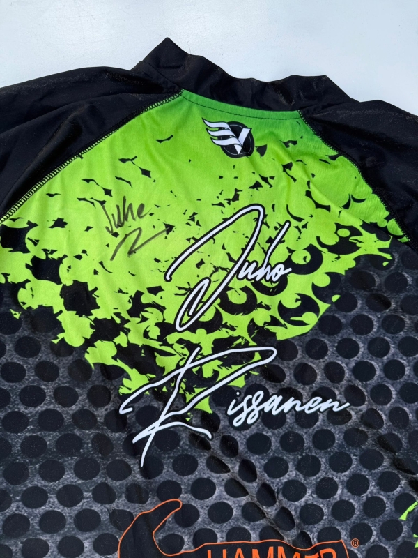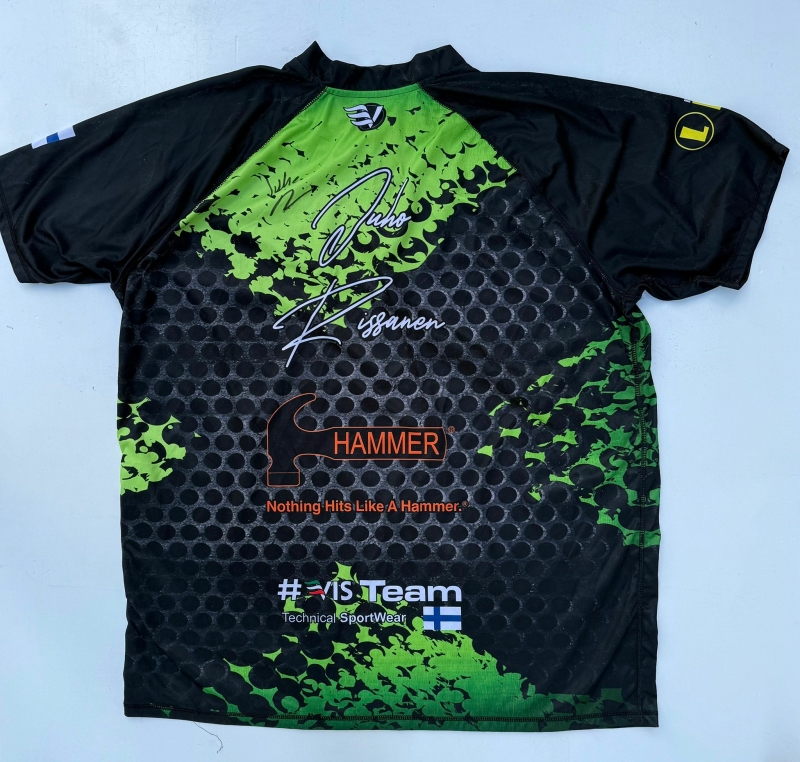 #1904 Juho Rissanen signeerattu keilapaita. Paidalla heitetty 2x300 sarjat