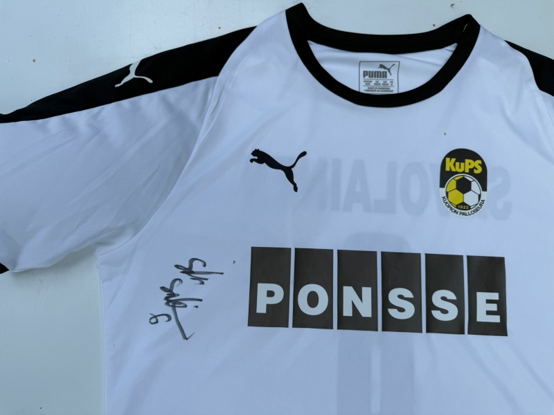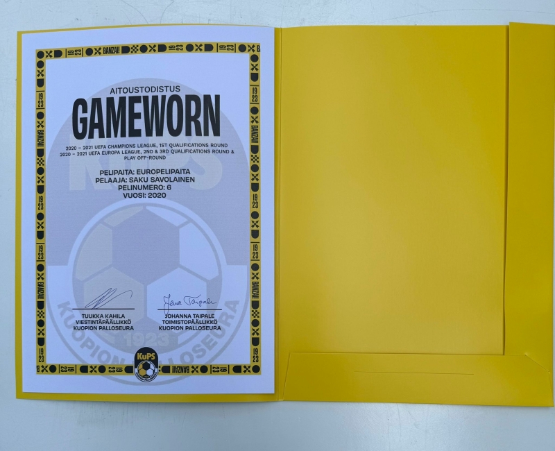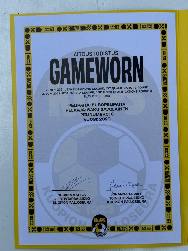 #1909 Saku Savolainen KuPS, signeerattu pelipaita, pelattu Mestarienliigaa ja Euroopanliiga karsinnoissa 2020, Gameworn aitoustodistus
