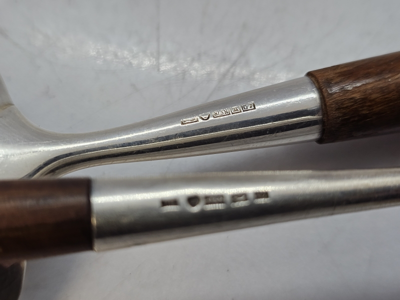 #1368 2kpl hopeisia kauhoja puuvarsilla, mm. Väinö Hamara