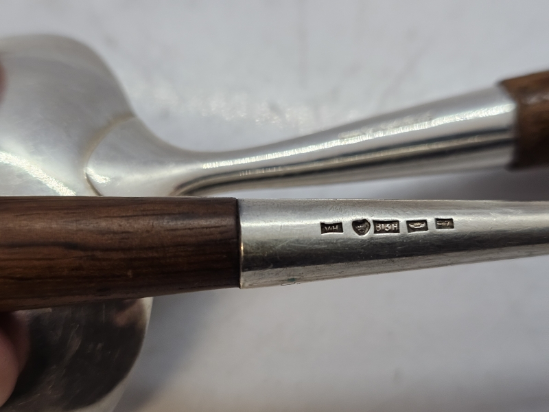 #1368 - 2kpl hopeisia kauhoja puuvarsilla, mm. Väinö Hamara