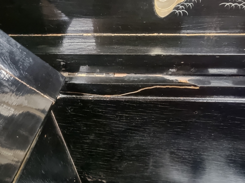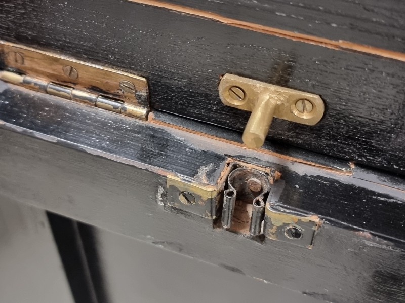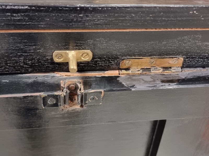 Kulumaa, puutteita maalissa, korjauksia ja vikaa saranoiden kohdalla. L: 95cm, S: 48cm ja K: 105cm (avattuna 144cm).