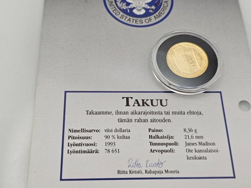 #1390 - Kultakolikko - Amerikkalaiset kultadollarit, James Madison, 8,36g