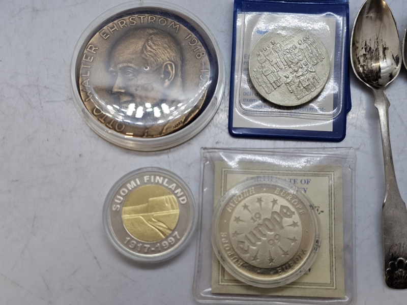 #1437 Erä hopeisia kahvilusikoita 1800-luvulta, juhlarahoja ym.