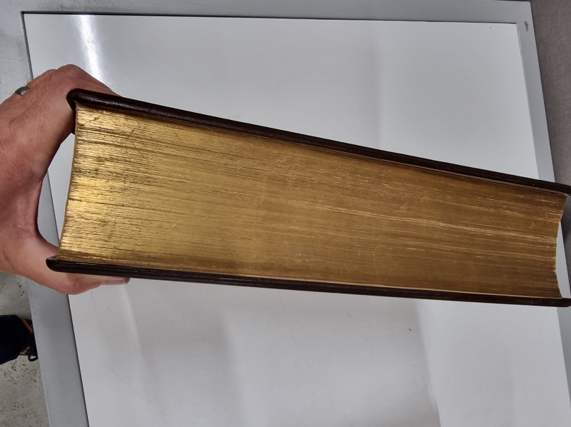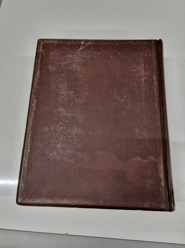 Kullatut sivun reunat, selkämyksessä kulumaa. Mitat 31cm x 37,5cm