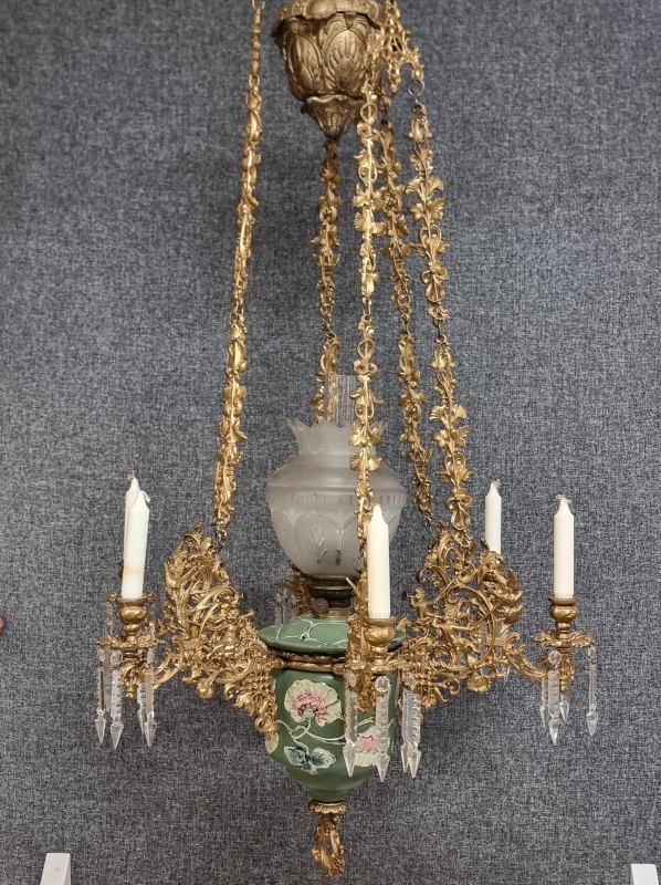#1938 Näyttävä messinkirunkoinen öljyvalaisin majolika-säiliöllä