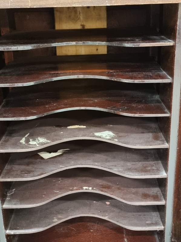 Mekanismi toimii. Ei avainta. Leveys: 56cm, korkeus suljettuna 117cm. Kulumaa