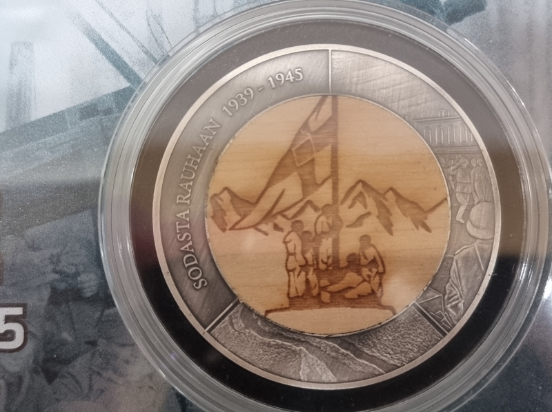 Tavisodan hengessä aja sodasta rauhaan - hopeamitali, jatkosodan aikainen 10 pennin raha, Hopeaa 999/1000 76g, 925/1000 62,2g