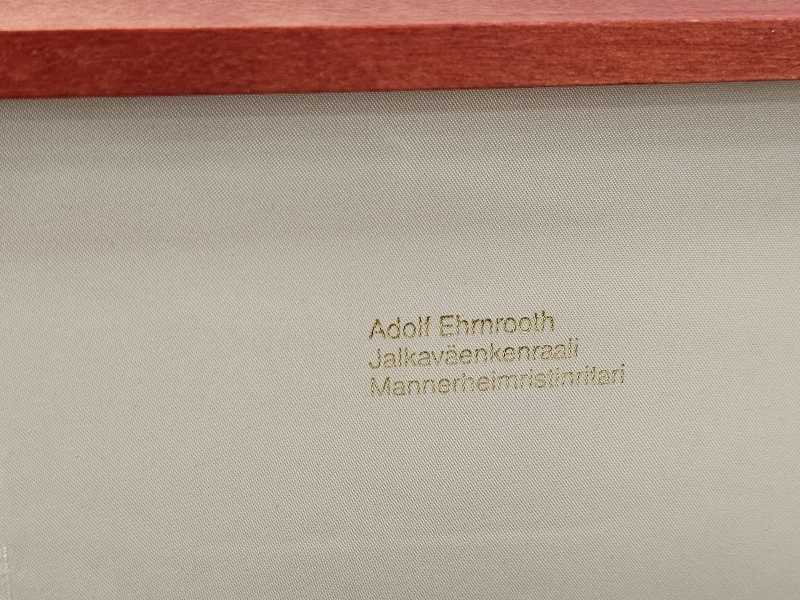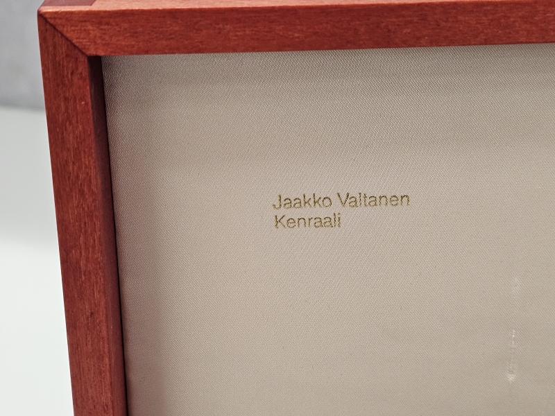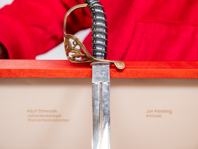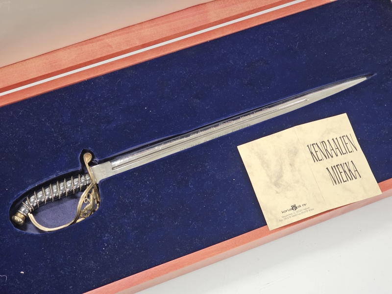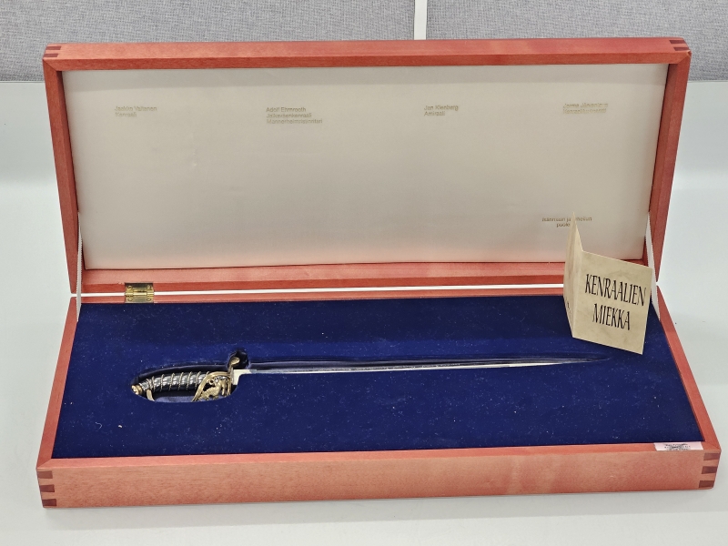 Miekassa kenraalien signeeraukset. Miekan paino 253g, pit: 40cm. Hienossa säilytysrasiassa jossa Suomi-leijonat. Nro. 30/100, valmistaja Jyrki Laisalmi