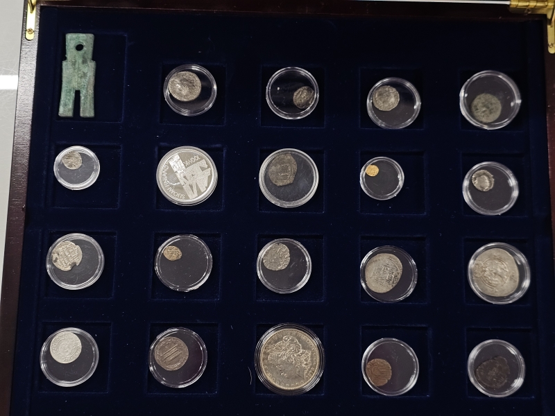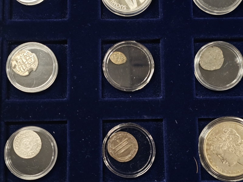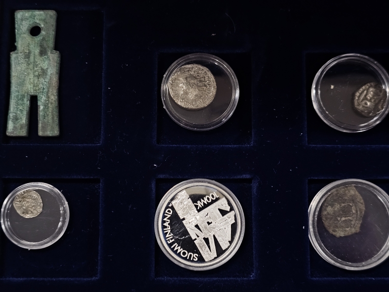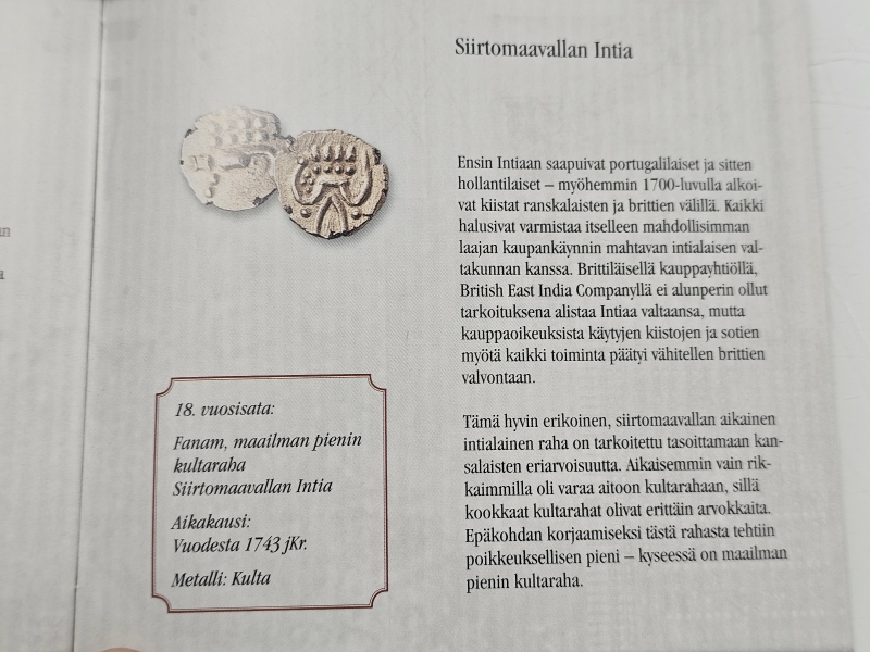 Sis. mm kiinalaisen Wang Mang -lapiorahan, maailman pienimmän Fanam-kultarahan [paino 0,38g] ja Suomen v. 2000 100mk