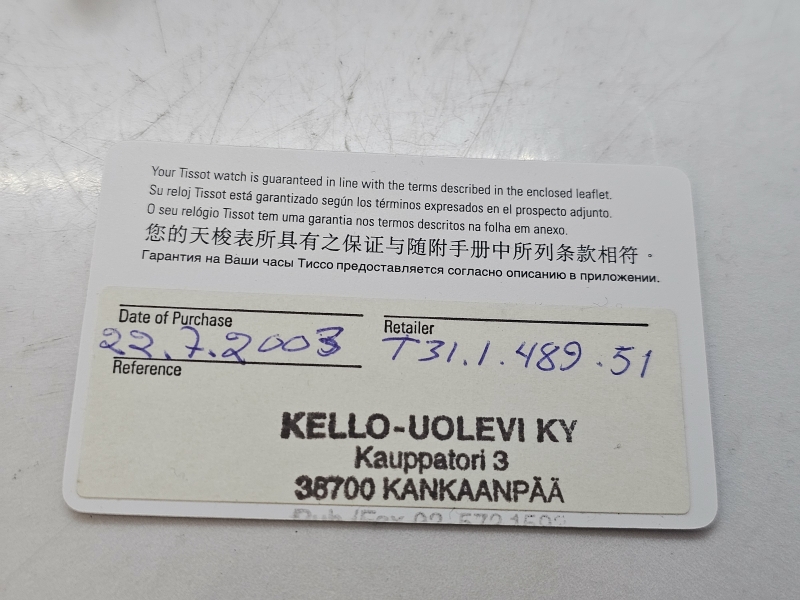 Ref: T31.1.489.51. Mukana laatikko, ohjekirja ym. H: 38,5mm. Kellon akkupatteri saattaa vaatia huollon, käy hieman epäsäännöllisesti