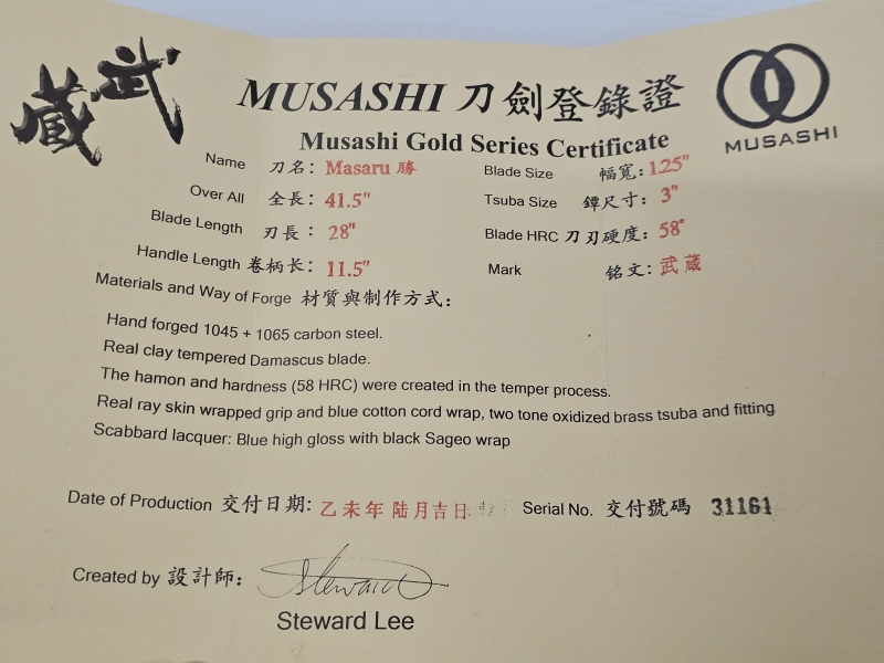 #1613 Hyvälaatuinen käsintaottu samuraimiekka, Musashi