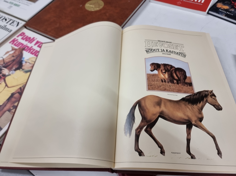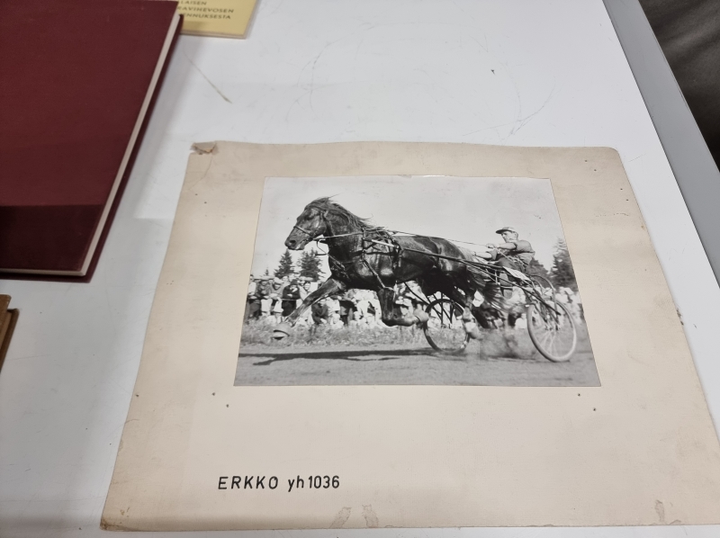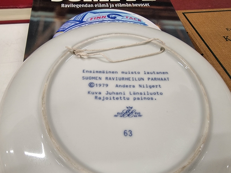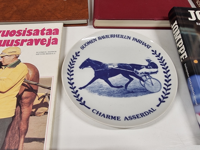 #2052 Hyvä erä hevosurheilukirjoja ja Suomen raviurheilun parhaat -keräilylautanen ym.