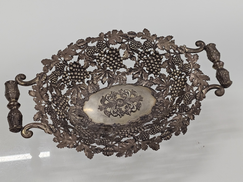 Paino 395g. Epäselvät leimat, testattu XRF-laitteella noin 830/1000 hopeaksi. P: 36cm
