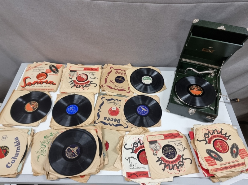 #2061 - His Masters Voice matkagramofoni + paljon levyjä